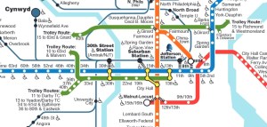 City Hall is also the hub of Philly’s mass transit. There are two main subway lines, one running north and south under Broad Street and one running east to west under Market Street. What befuddled me is that there are also trolley routes heading out to the suburbs. This is a Good Thing, especially since there are connections to the subway lines. What isn’t good is that the maps of the system DON’T give you the details of where those connected routes go!