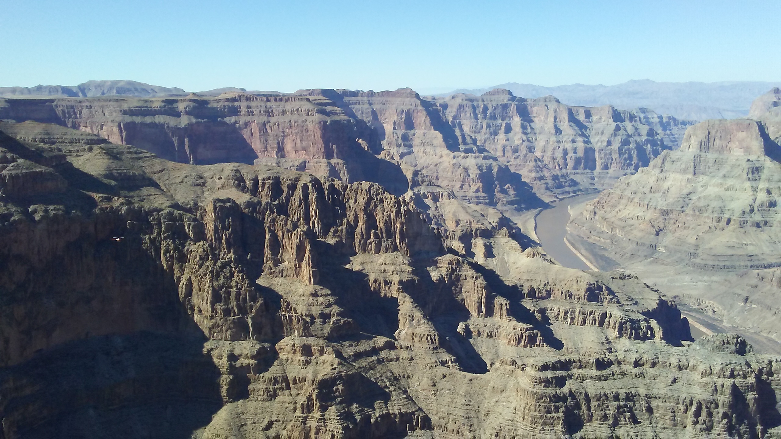 I’m not going to bother you with photos (well, just one to give you some hint of the scale). Photos cannot possibly do the canyon justice; and even when you’re there, it’s far too easy to get overwhelmed with the sheer vastness of it. See that little dot over against the shadows on the left? That’s one of the tourist helicopters….