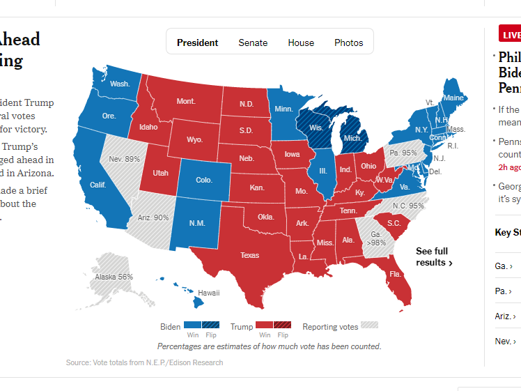 The New York Times is a bit better. They have the “uncalled” states with a diagonal gray hashing, with the “percent of ballots counted” over them. That’s fine, but why are Wisconsin and Michigan a darker blue? Oh, that’ because you REALLY NEED TO KNOW that they went Republican in 2016…..