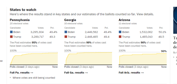 That tells me NOTHING. Okay, I can see that Biden has 3,295,304 votes and Trump has 3,282,717 votes with about 95% of the ballots counted. But what I really need and want to know is how much is Biden’s lead, and about how many ballots are left to count? Yes, it’s nice to know that Joe is in front five seconds in this footrace, but when I don’t know how long the race is, that’s useless! Is it the 800 meter or 10 Km? And how close is he to the finish line?