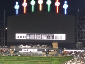 Wrigley is one of the oldest stadia in baseball, and although it’s clean and functional and by no means run down, it’s missing many of the amenities one expects of a contemporary sports facility. On the plus side, no giant electronic scoreboard showing silly animations and telling fans “Let’s Make Some Noise”. On the negative side, the main scoreboard does NOT show the standard line score of runs per inning with the total runs, hits, and errors. It does show the runs per inning for every game being played, but barely highlights that of the game you’re watching. There are also a bunch of numbers here and there that have no identification to tell you what they are. They are not the numbers for the pitchers in the game, that much is clear. Oh, it’s a manual scoreboard, too.