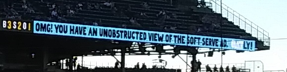 As you can tell from the ticket, my seat was up in the nosebleed level. The place had all the amenities and bells and whistles I’m used to at major league stadia. And although the main electronic scoreboard did indeed display all sorts of information, it did “glitch” during the game….