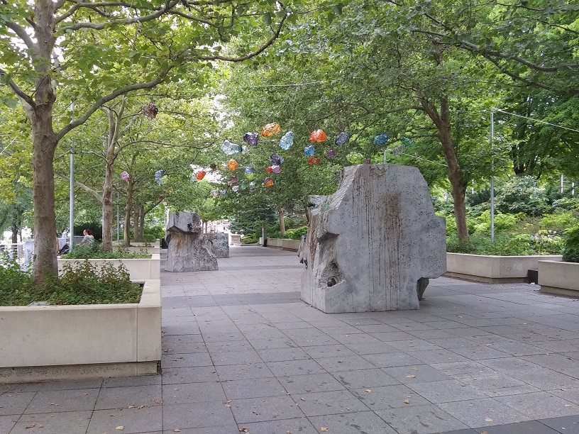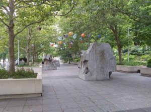 Another example was outside, in nearby Millennium Park. An “installation” by Christine Tarkowski, the official name is too long to bother with here (a quote from William Herschel, it’s something on the order of 50 to 60 words long). According to the sign, it (supposedly) “questions and critiques (with gentle irony) how we design and build cities, as well as manipulate and re-present natural forms”…. Dude, it’s a trio of huge, rough blocks of concrete, over which (just out of reach) are suspended hollow blobs of colored glass that glint and glisten in the light. I see nothing of your silliness about cities and natural forms; I see bits of color arranged in a whimsical manner that should bring a smile to the face of anyone walking underneath them. Does it HAVE to be serious? Can’t ART be fun and playful?