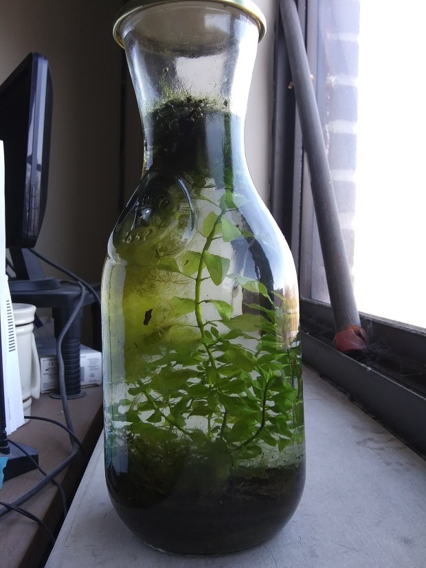 The plants are “yellower” than they were two months ago, and there’s not much in the way of animal (insect and snail) activity. I hope it’s just because of Winter, and not that everything is dying. You’ll note that that sprouty plant – the one with the leaves – has taken over, and the hornwort has died away. The last diving beetle has died; its corpse is stuck in the fuzzy green algae (and not visible in the photo). Also note that a few snails have “suicided” by climbing up the sides and out of the water. Some bits of algae have also crept up the sides. It’s also hard to see, but there are a few bubbles trapped in the mess of algae at the top. They’ve been there since the beginning.…