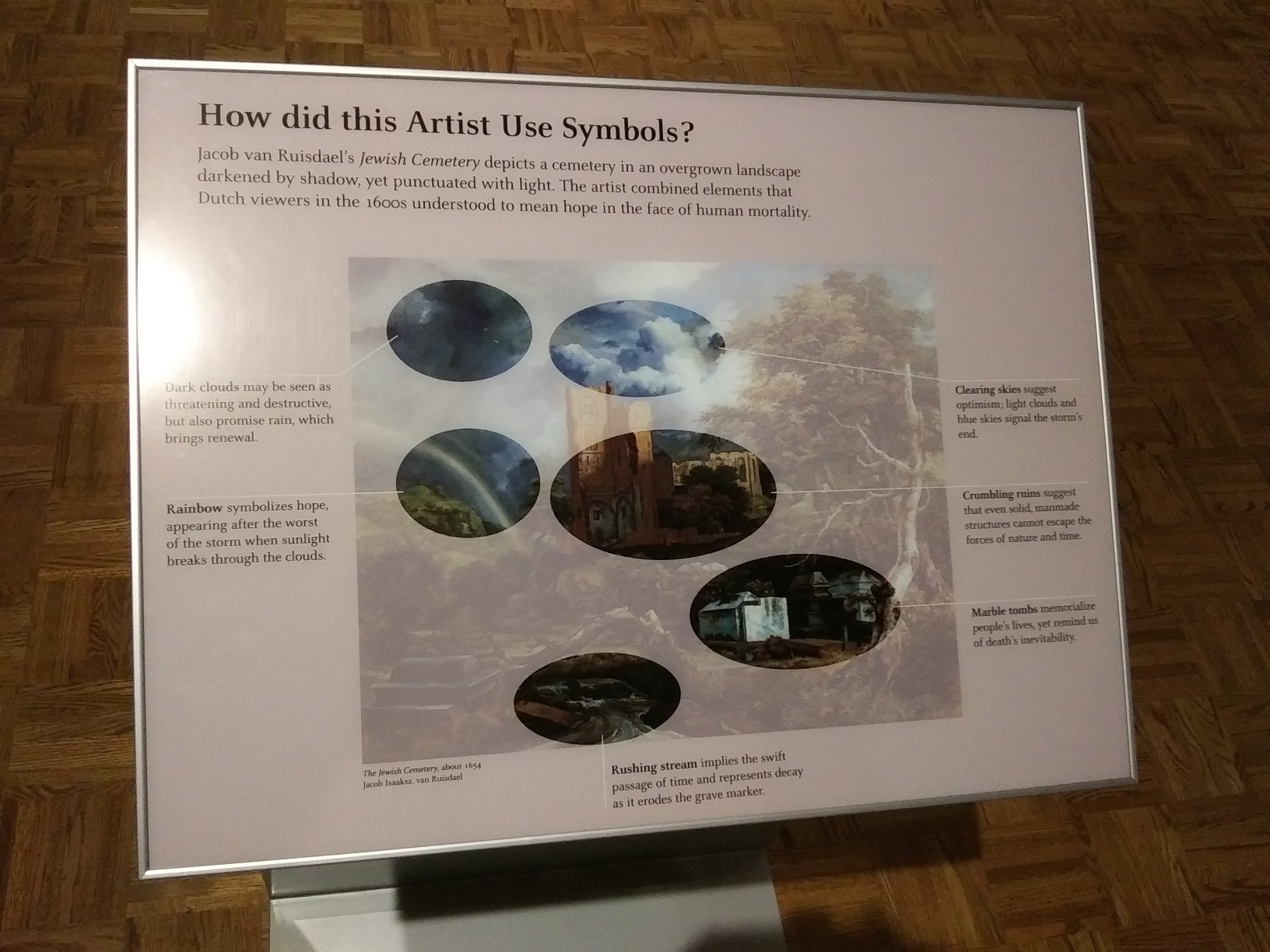 Of greater significance to the casual visitor are the handful of special explanatory panels that give a curator’s insight into a painting. To us, that’s just a landscape of a church and cemetery in a storm. Nice, but so what? The panel points out all the symbolism that the original audience would have spotted almost immediately.