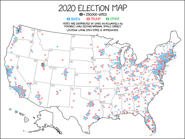One last try. What if we kept the map of the US that everyone knows, but just put dots on it to indicate where the votes came from? You’d need to decide how fine a level of detail you want….