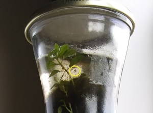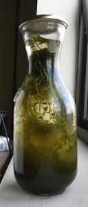 There have been some notable changes since I decided to tweak things a bit. Last time I mentioned adding a teeny bit of eggshell to add some calcium to it (it’s a suggestion to help snails grow). Well, I did. Just the tiniest fragment I could manage. I also added some more water from the source pond, and poked at that green lump at the top with a stick. Since it felt rather solid, I reasoned that it might be restricting water circulation. I pushed it around enough to open a ‘channel’ to the rest of the jar.