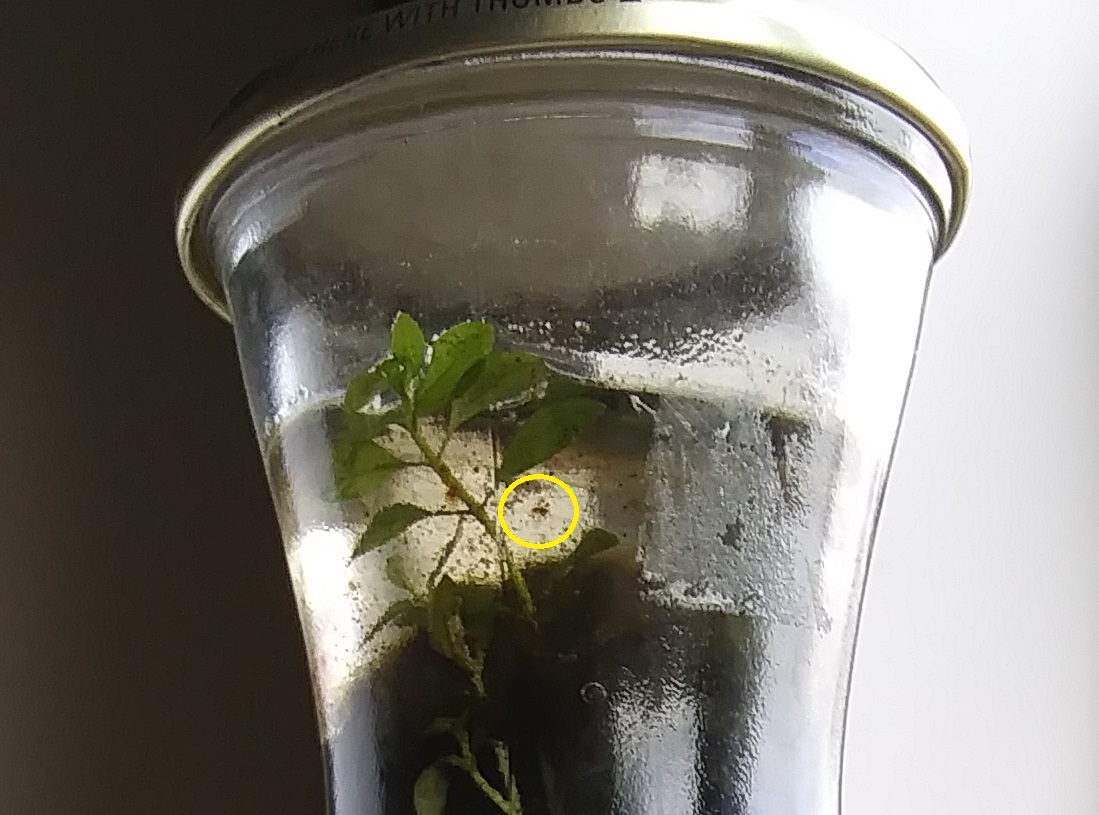 The circle highlights one of the larger brown spots. The whitish square on the side is residue from a bit of tape I used to track the water level.