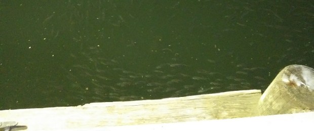 There are, of course, the usual displays – Amazon rain forest, Pacific and Atlantic coral reefs, “Touch Pool”, local waters – but the one that impressed me the most was the one that’s not actually in the building. In the space between the two piers* occupied by the Aquarium, they are building an artificial wetland as a test project for wetlands restoration. It’s working – a staffer I chatted with said that river otters were seen checking the place out – while it was under construction. And I did spot a school of fish that had made it all the way to the “land” end of the space (through the wetland) one night. Probably attracted by the lights….